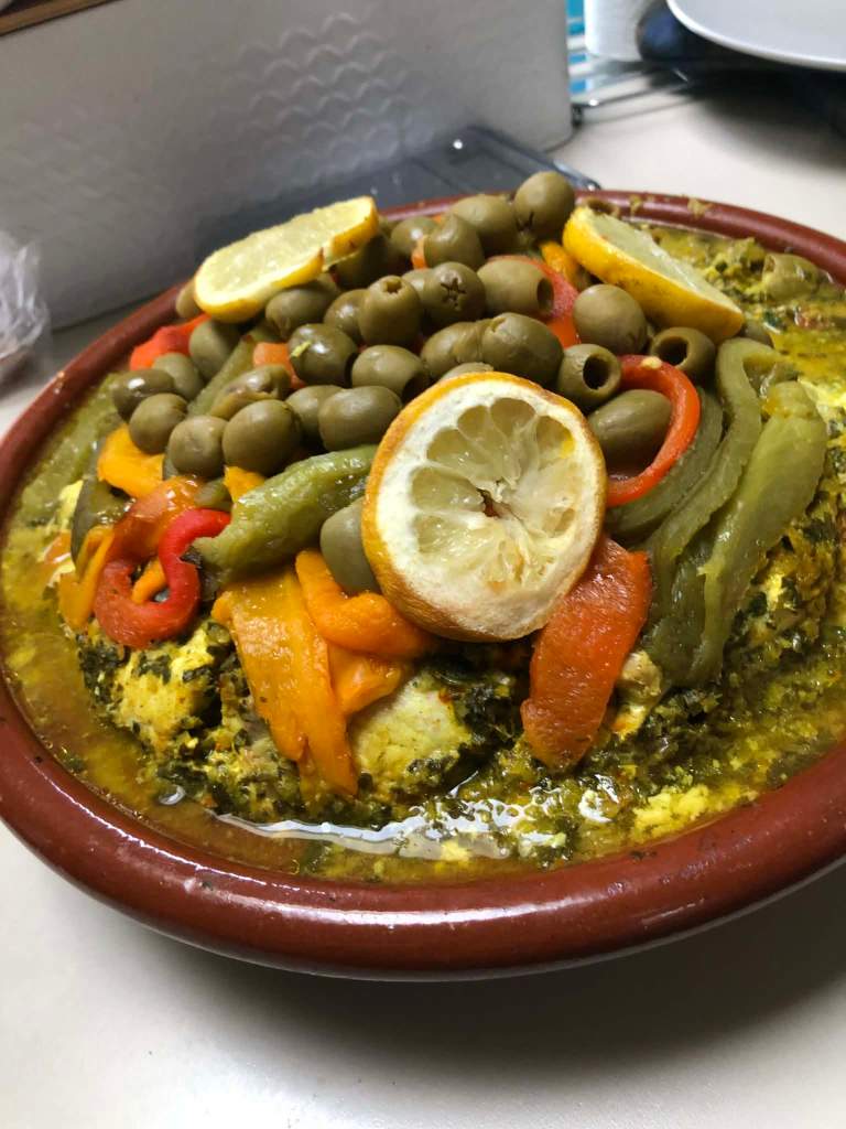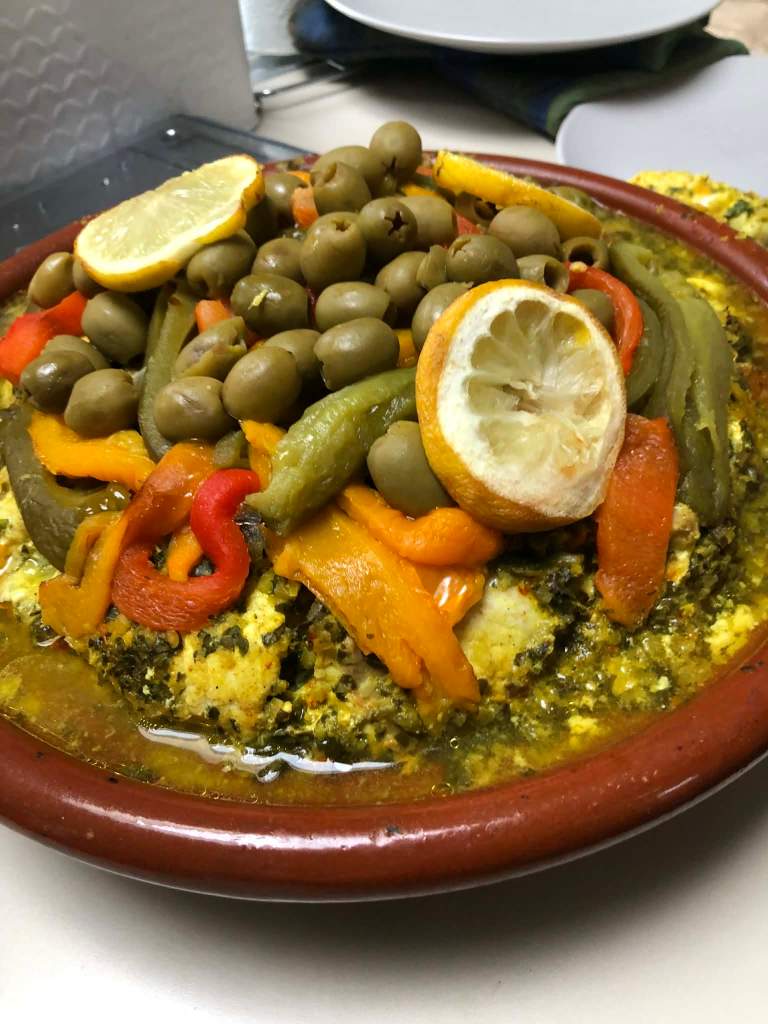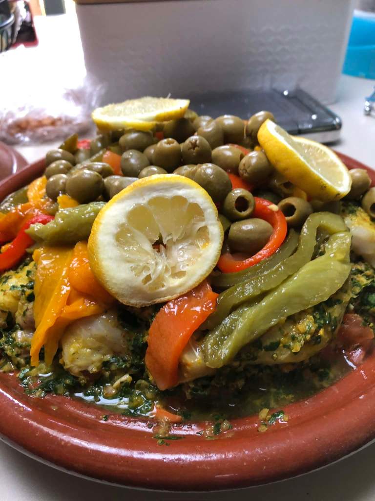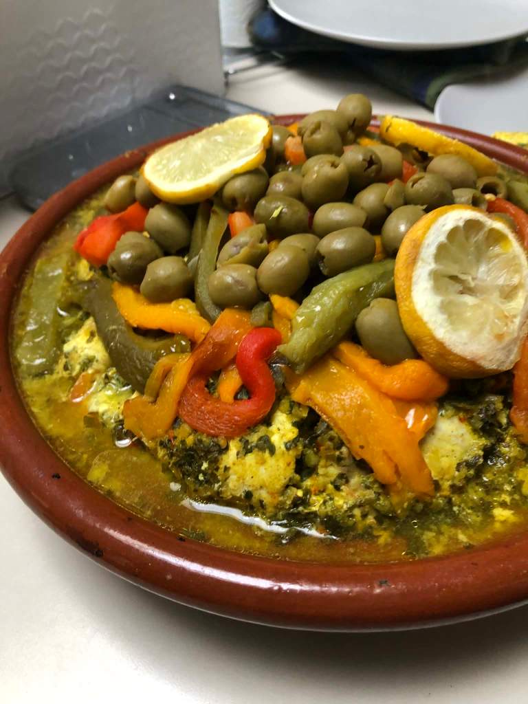 J’adore la cuisine du Maghreb et des tajines j’en ai déjà fait un paquet. Mais des tajines au poisson je n’en avais jamais tentées. Ce midi pour le repas du dimanche j’ai mariné du cabillaud, de l’églefin et de la sébaste à la chermoula, avant de cuire les poissons entre une couche de pommes de terre et de carottes d’un côté et des poivrons et des olives de l’autre.