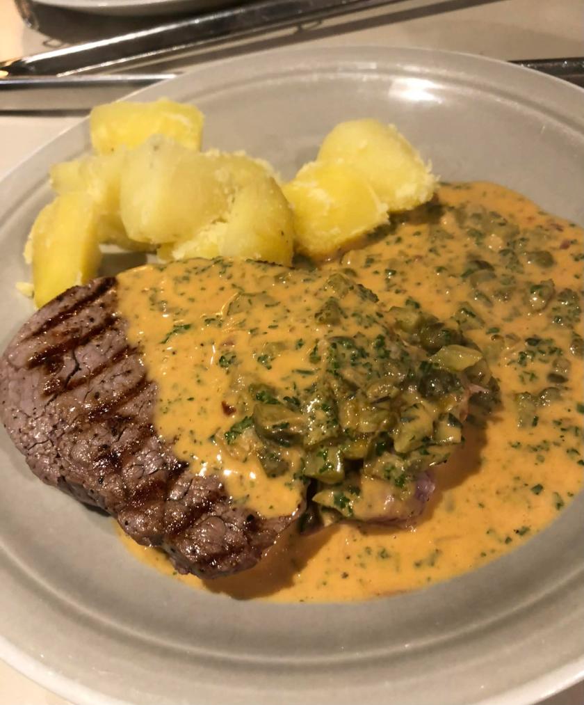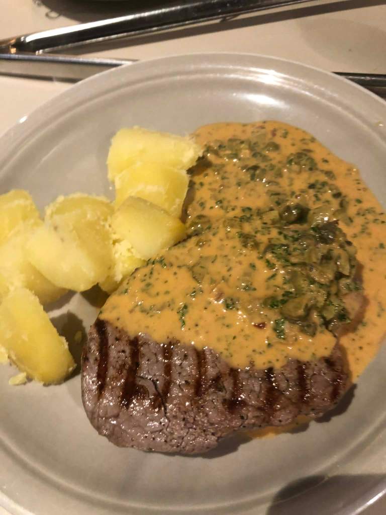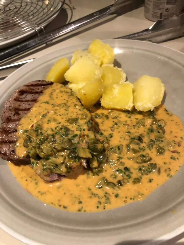Ma Sabine a été désarçonnée par le curry et le cognac dans la sauce. Moi j’ai bien aimé cette sauce suisse aux milles ingrédients. Je pensais accompagner d’abord d’haricots verts aux oignons, mais je n’en avais plus des pré-blanchies au surgélateur. Ensuite je me suis souvenu du sachet de salade composée qu’on avait au frigo, mais la salade se liquéfiait déjà. Donc viande, patates et sauce, pas de légumes.