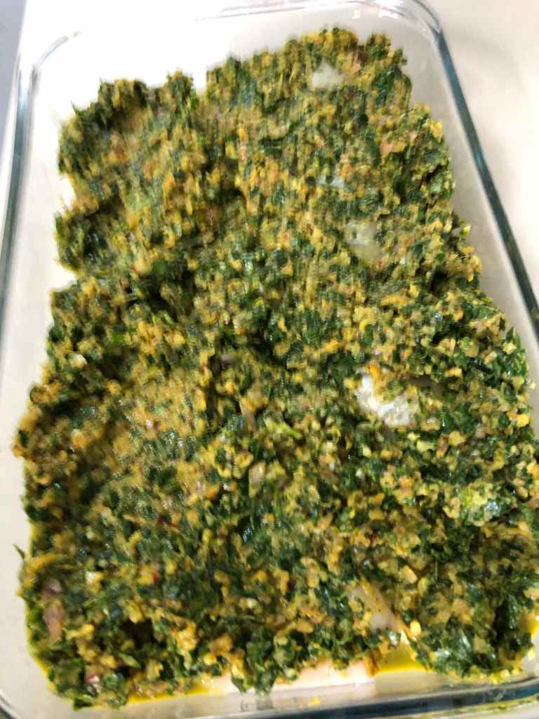 Dans un plat pouvant contenir le poisson en ne laissant pas trop d’espace de libre, placer les morceaux de poisson. Verser la chermoula dessus et filmer le plat. Laisser mariner le poisson pendant 1 heure au frigo.