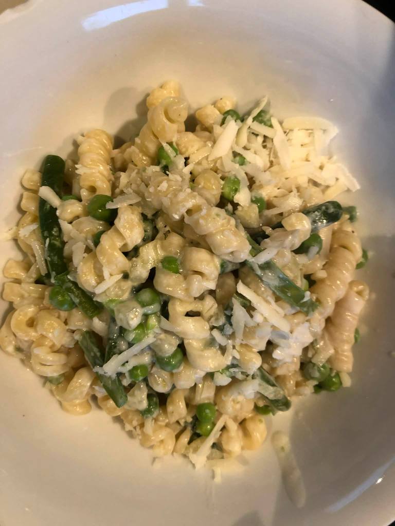 Pendant ce temps, cuire les pâtes al dente dans la même eau de cuisson que les haricots et les petits pois.