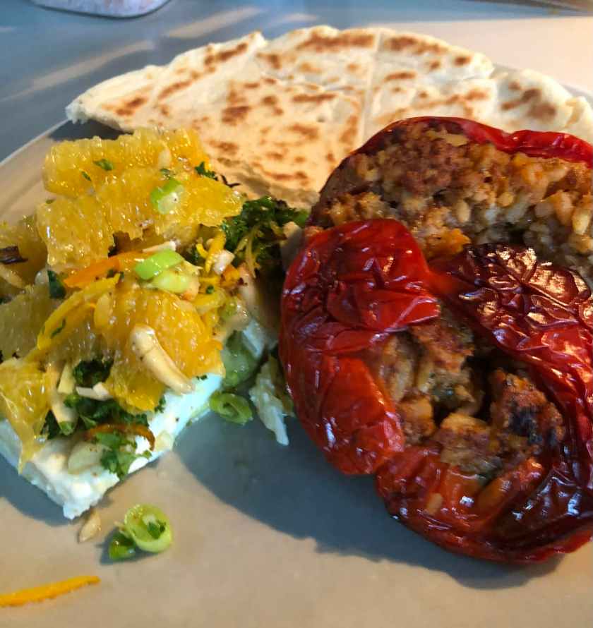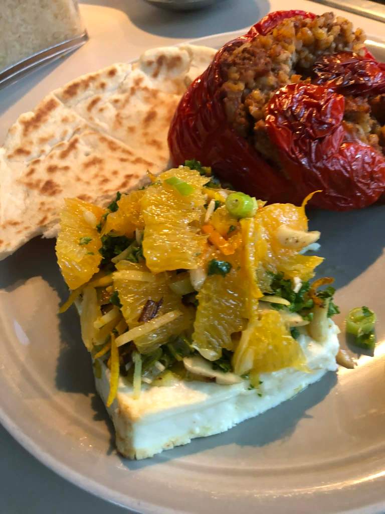 Avant de dresser, y ajouter la salade de blé, les quartiers d’orange et le reste des grains de grenade.