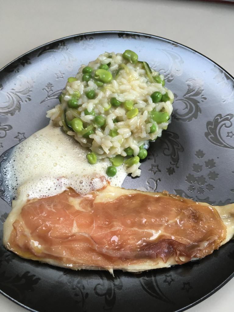 Filet de truite des Ardennes au jambon de Parme, risotto bianco aux courgettes, petits pois et fèves, sauce crème à l’anis étoilé et orange