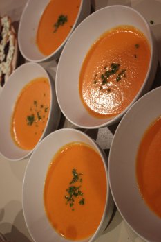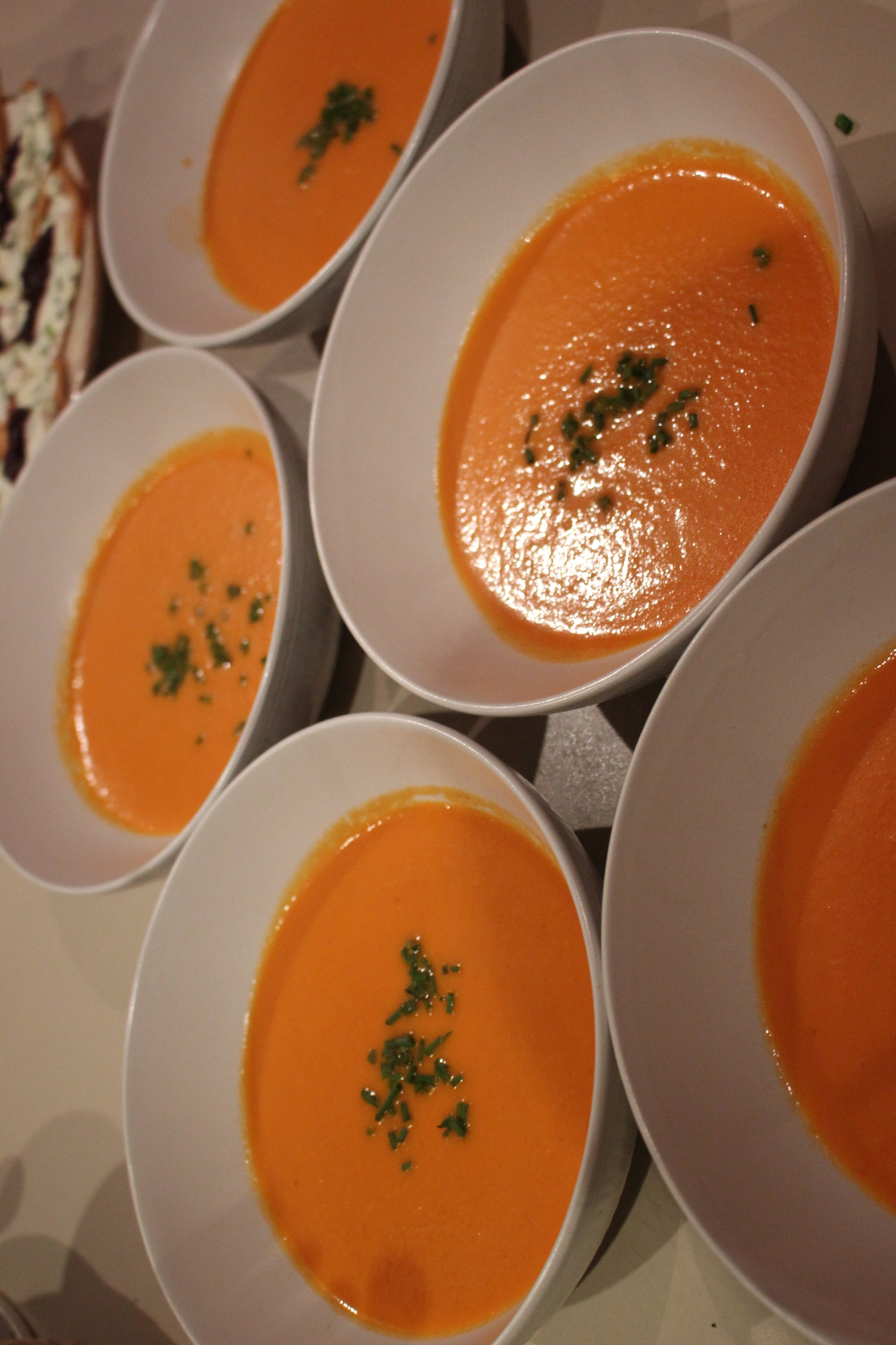 Noël 2018 : Potage : Crème de poivrons rouges grillés et gingembre, petits toasts au chèvre frais et confiture d’olives noires et zestes de citron