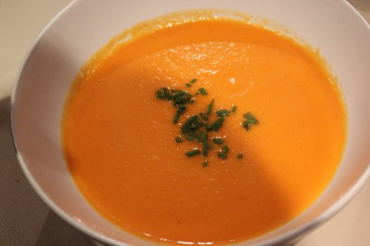Noël 2018 : Potage : Crème de poivrons rouges grillés et gingembre, petits toasts au chèvre frais et confiture d’olives noires et zestes de citron