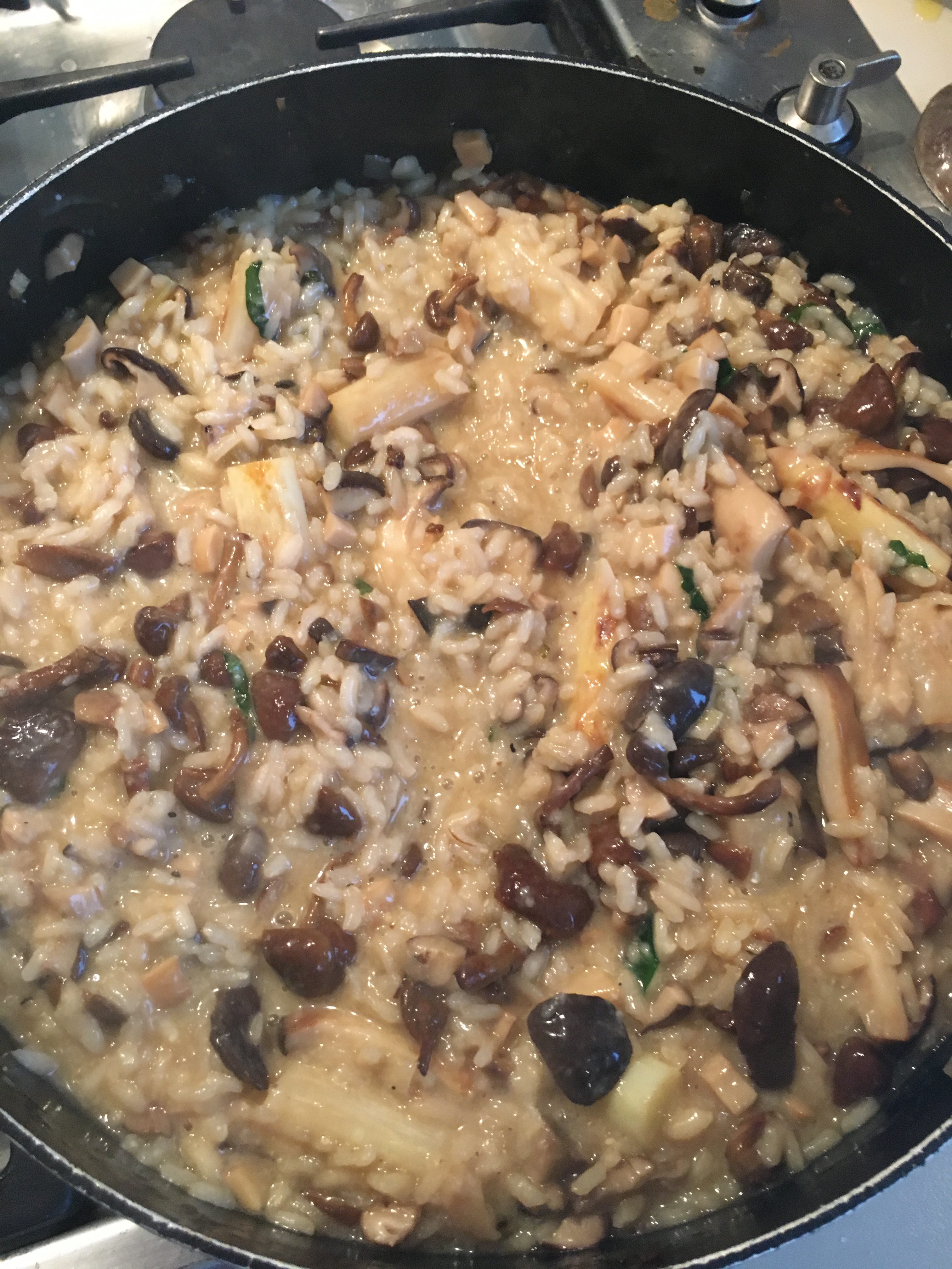 Risotto aux asperges blanches et champignons de Bruxelles (shiitake, eryngii et nameko)