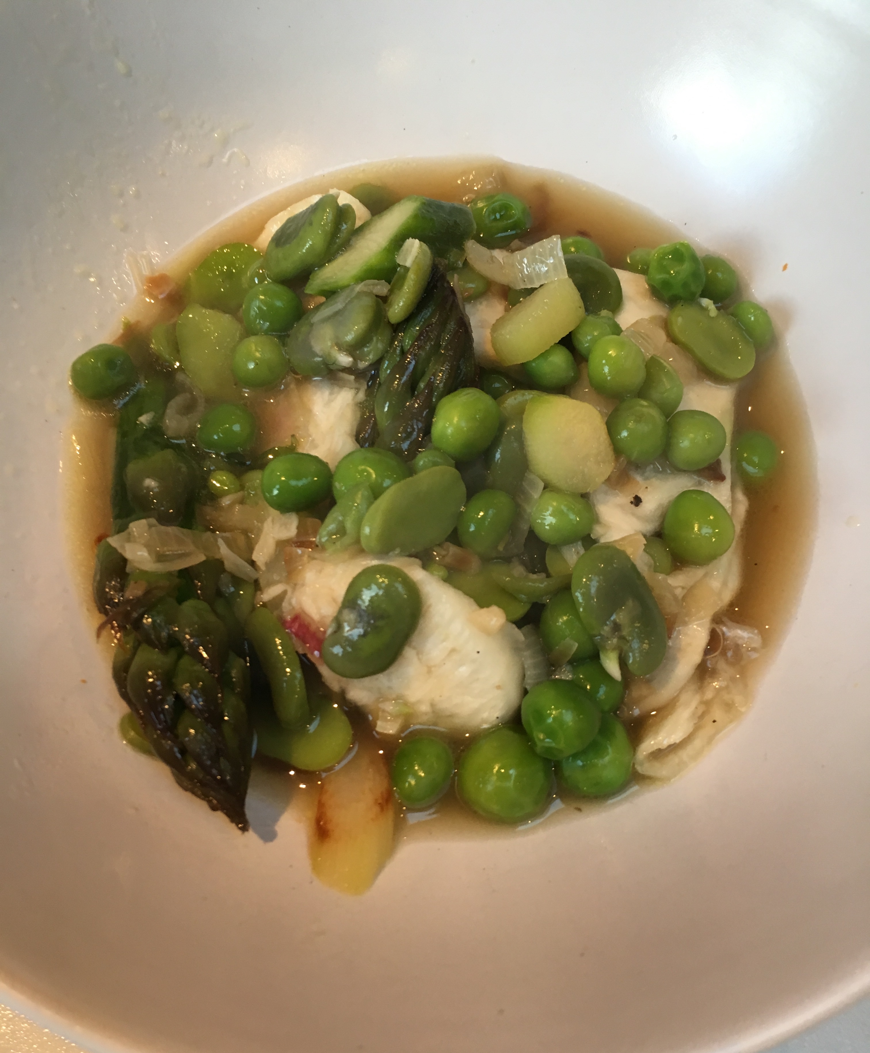 Etuvée d’asperges vertes et légumes printaniers au dashi et katsuobushi