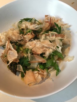Etuvée d’asperges vertes et légumes printaniers au dashi et katsuobushi