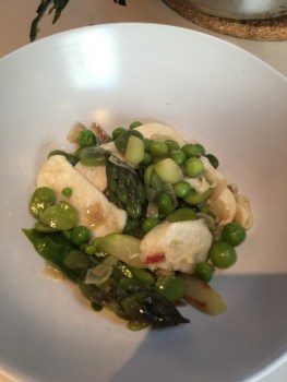 Etuvée d’asperges vertes et légumes printaniers au dashi et katsuobushi