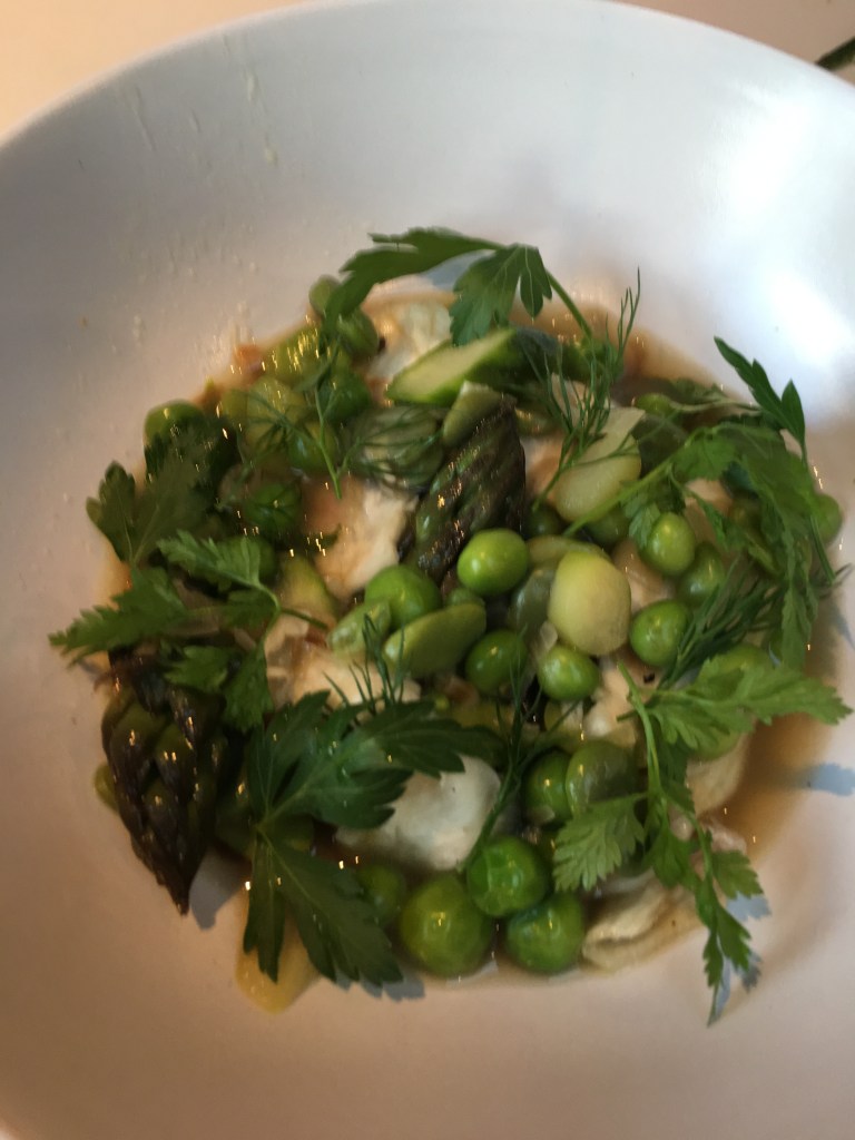 Etuvée d’asperges vertes et légumes printaniers au dashi et katsuobushi