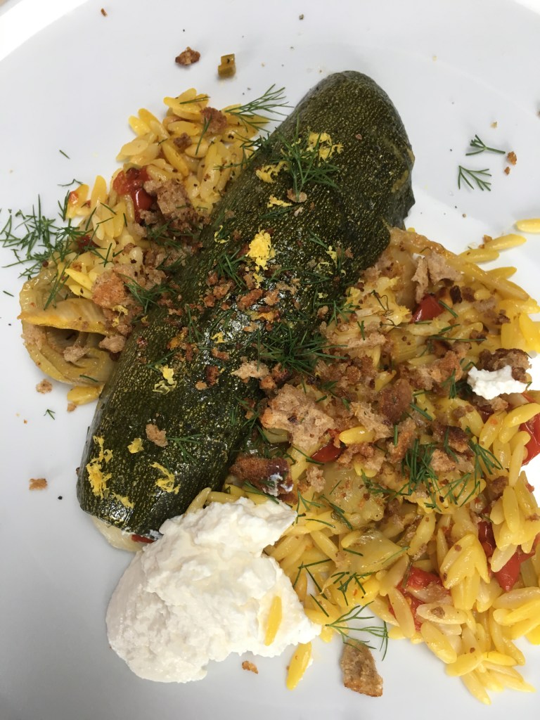 Orzo au safran et piment, fenouil, tomates cerises, courgette, ricotta et comme une gremolata au pain de seigle au levain, soupçon d’aneth