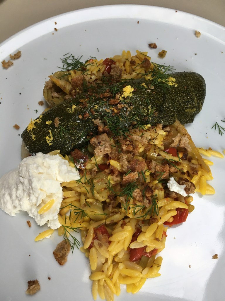 Orzo au safran et piment, fenouil, tomates cerises, courgette, ricotta et comme une gremolata au pain de seigle au levain, soupçon d’aneth