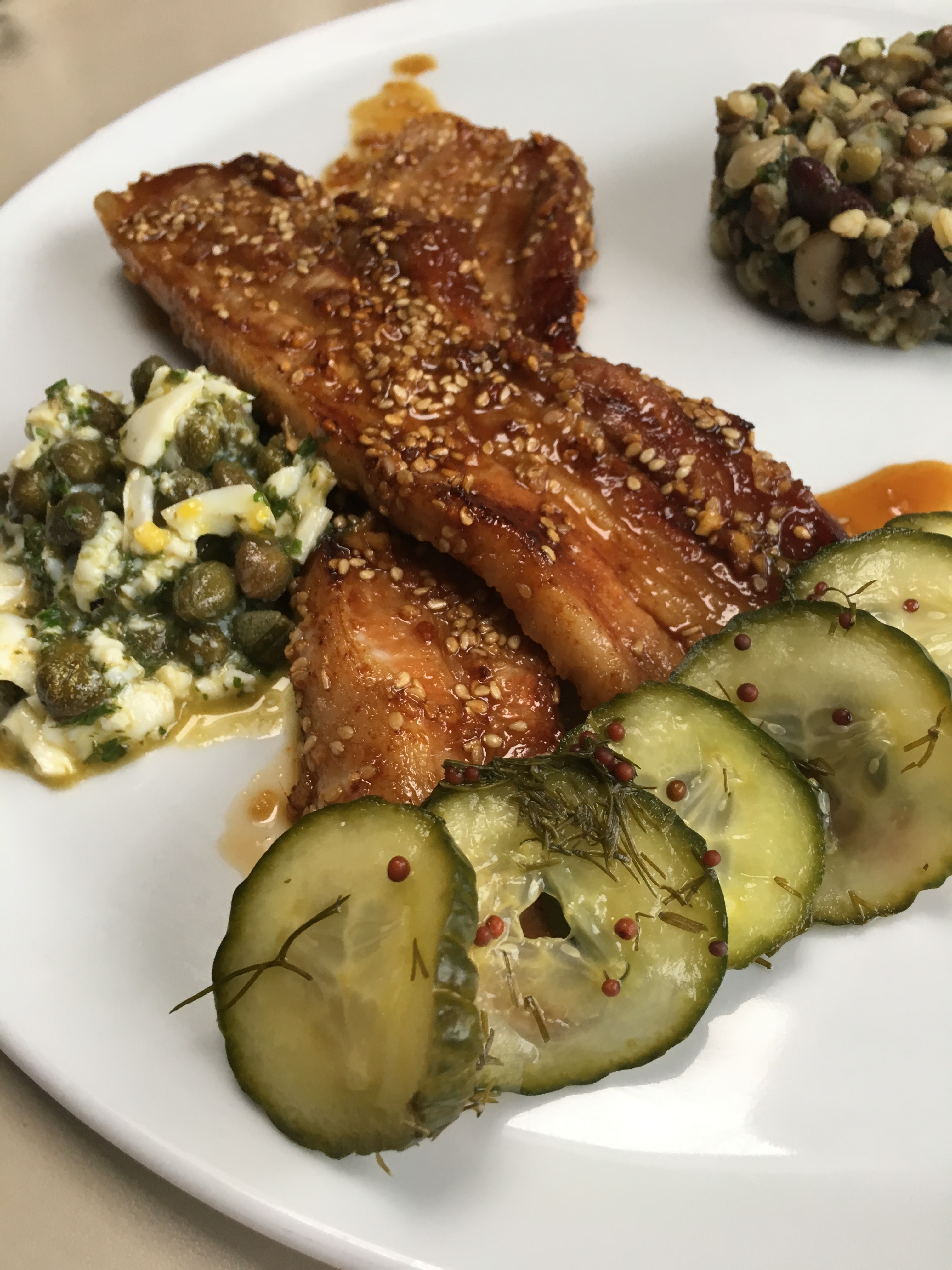 Poitrine grillée à l’asiatique, concombre en pickles, salade de légumes secs et blé aux herbes, œufs mollets aux câpres et herbes fraiches