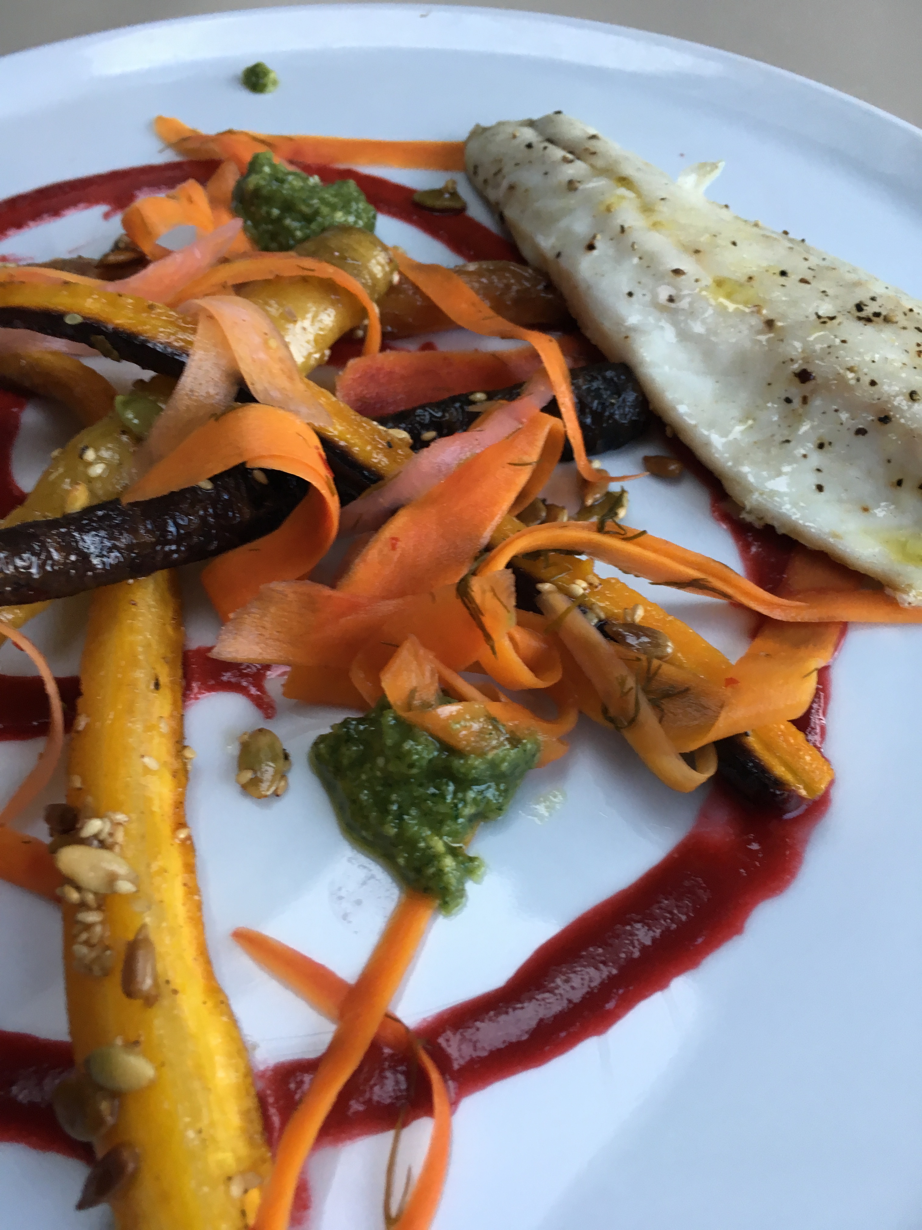 Filet de bar, carottes rôties aux trois graines, carottes en pickles, pesto frais de fanes de carottes, coulis de betterave à l’orange