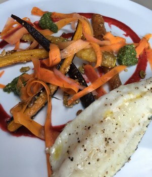 Filet de bar, carottes rôties aux trois graines, carottes en pickles, pesto frais de fanes de carottes, coulis de betterave à l’orange