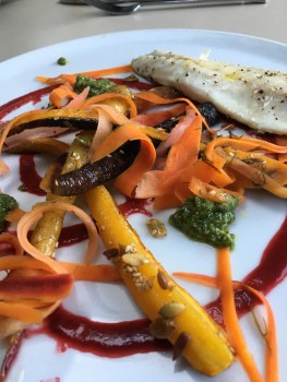 Filet de bar, carottes rôties aux trois graines, carottes en pickles, pesto frais de fanes de carottes, coulis de betterave à l’orange