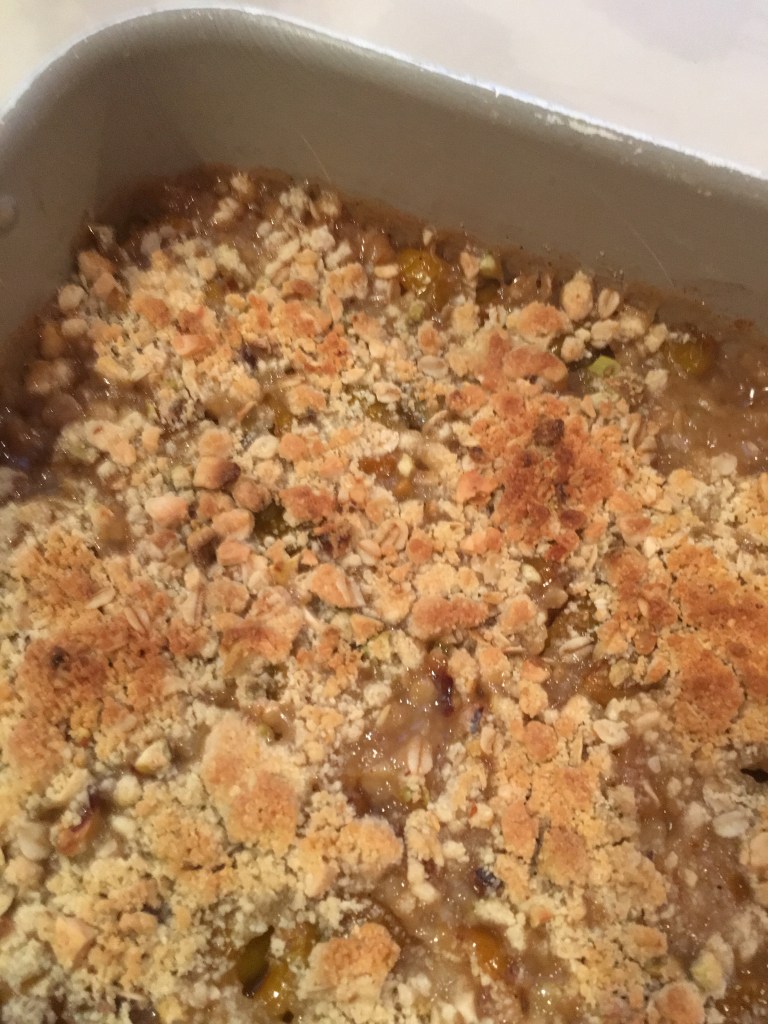 Crumble aux mirabelles et pistaches, amandes, avoine