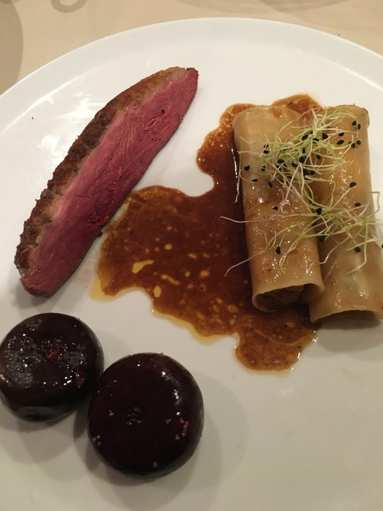 Magret de canard BT, jus de canard tranché, figues au vin rouge épicé, cannelloni de girolles et jeunes pousses d’ail