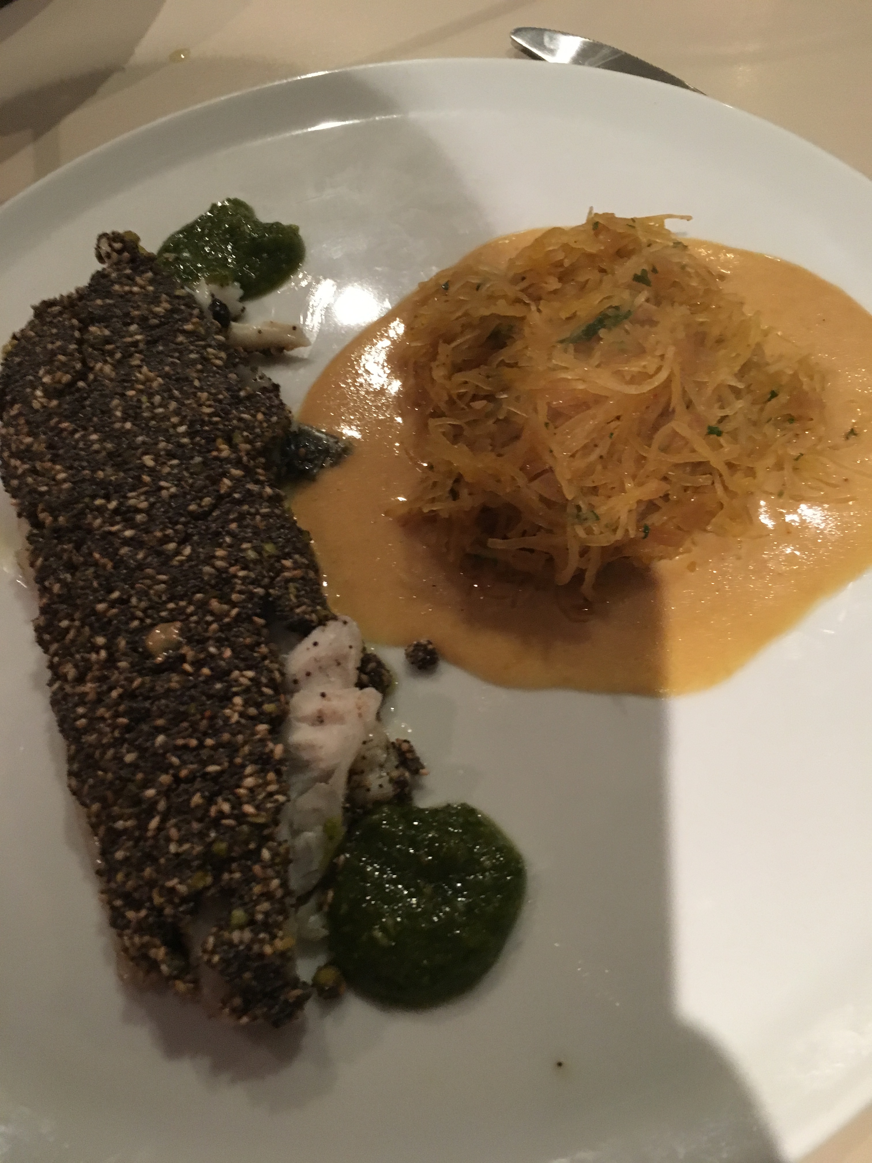 Bar en croûte sésame-pavot-pistache, sauté de courge spaghetti ‘des collines’, crème de vieux comté et pesto de pistaches