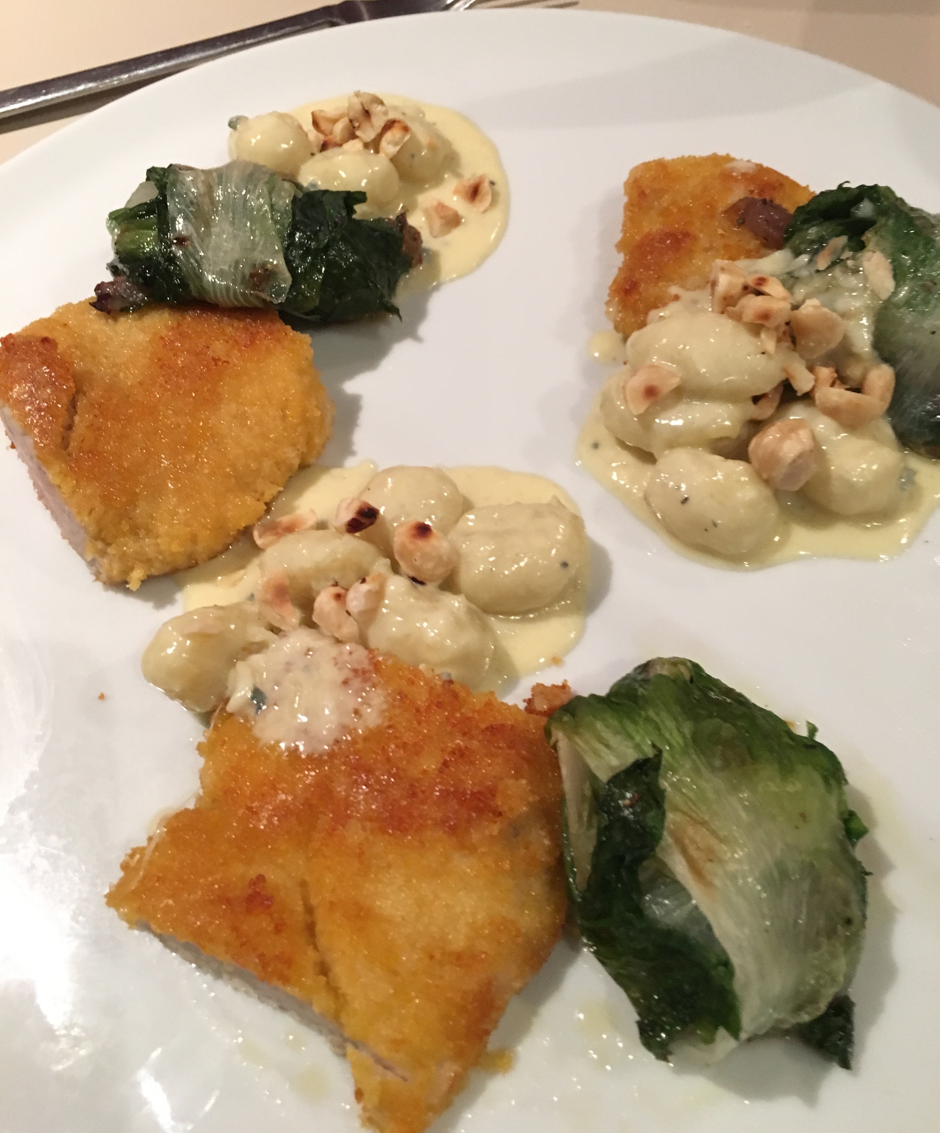 Escalopes pannées, scarole en ballottines comme à Naples, gnocchi à la crème de 5 fromages