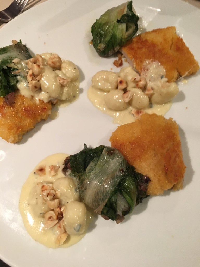 Escalopes pannées, scarole en ballottines comme à Naples, gnocchi à la crème de 5 fromages