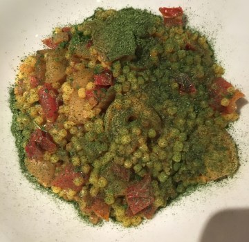 Fregola Sardes anisées aux crevettes, jus de moules et poudre de fanes de carottes