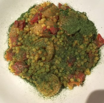 Fregola Sardes anisées aux crevettes, jus de moules et poudre de fanes de carottes