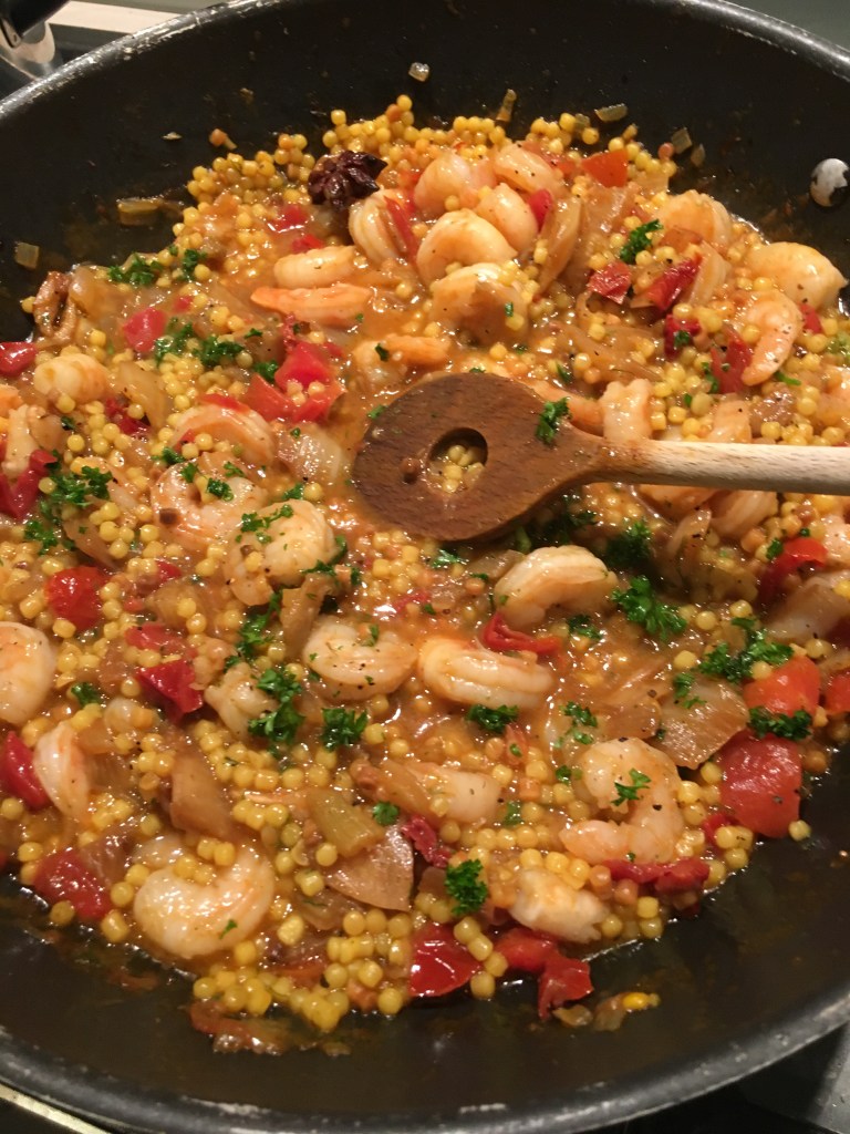 Fregola Sardes anisées aux crevettes, jus de moules et poudre de fanes de carottes