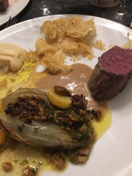 Noël 2019 : Plat principal : Filet de chevreuil sous-vide en basse température, chicons braisés aux clémentines comme Piège, crème de panais au chocolat blanc, sauce Albuféra version Chappel/Piège et pommes gaufrettes