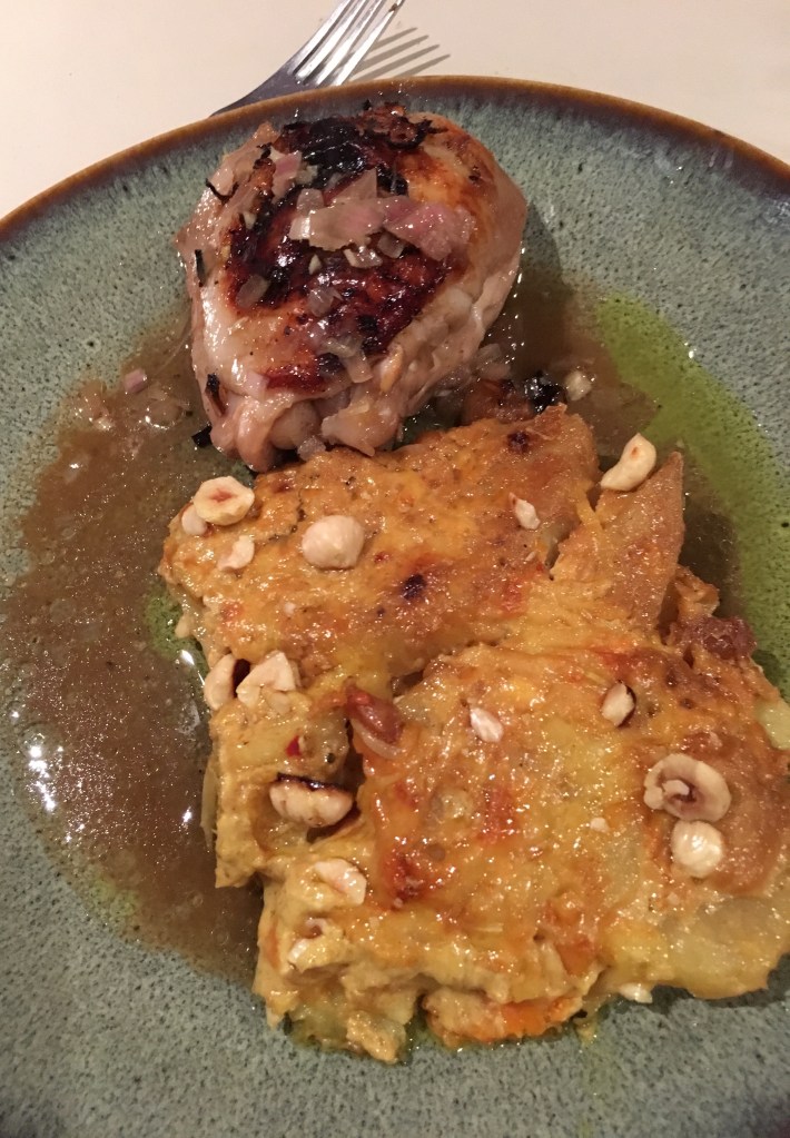 Gratin de patates douces coco-cacahuète et hauts de cuisses de poulet à la citronnelle