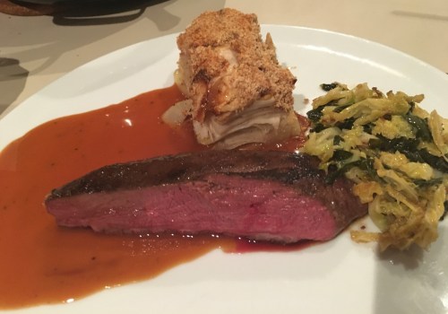 Magret de canard BT, sauce au sirop d’érable et argousier, mille-feuille de pommes de terre, navets et pommes et tombée de chou-vert et feuilles de navet