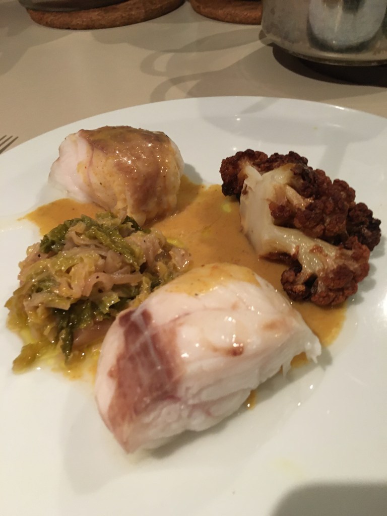 Queue de lotte pochée, chou-fleur rôti longuement au beurre clarifié, sauce coco-citronnelle au kari gosse
