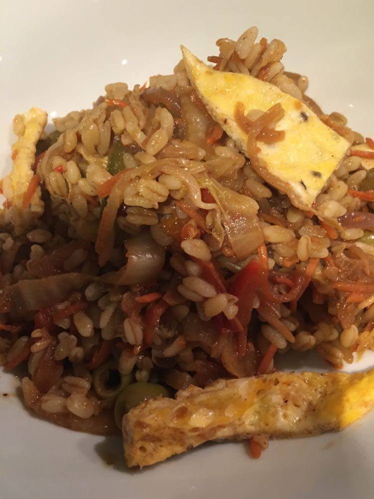 Salade de blé tiède aux légumes ‘hoisin & aigre-doux’, omelette