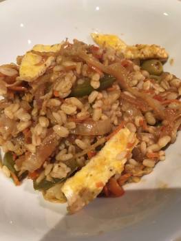 Salade de blé tiède aux légumes ‘hoisin & aigre-doux’, omelette