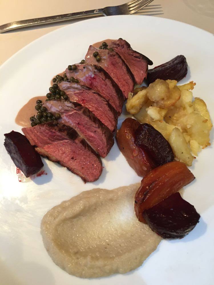 Magret de canard, betteraves, crème de topinambours, pdt tapées à la graisse de canard et sauce au poivre vert