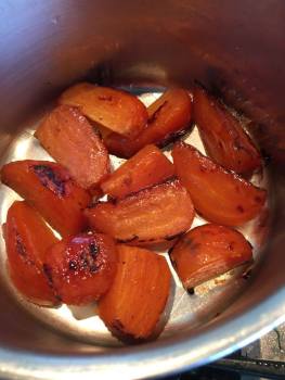 Magret de canard, betteraves, crème de topinambours, pdt tapées à la graisse de canard et sauce au poivre vert