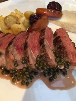Magret de canard, betteraves, crème de topinambours, pdt tapées à la graisse de canard et sauce au poivre vert