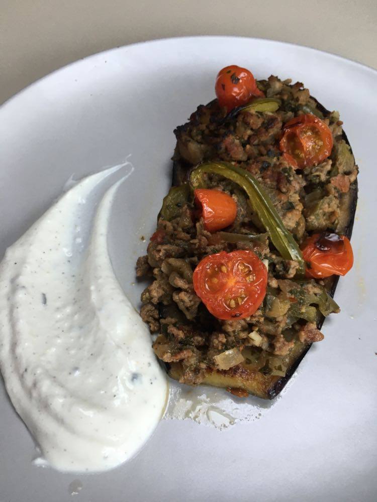 Patlican Karniyarik (aubergines ‘éventrées’ à la turque), sauce yaourt citronnée