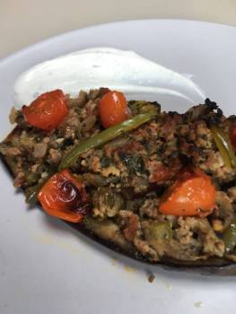 Patlican Karniyarik (aubergines ‘éventrées’ à la turque), sauce yaourt citronnée
