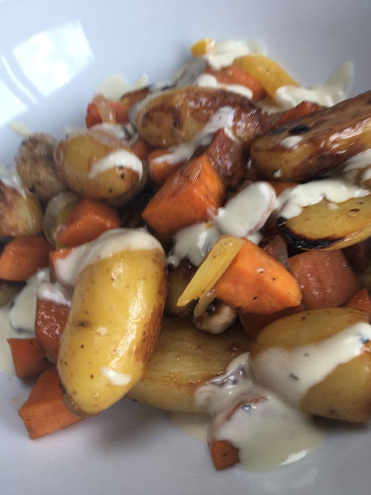 Poêlée de légumes au chorizo et crème de roquefort