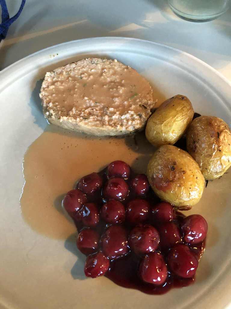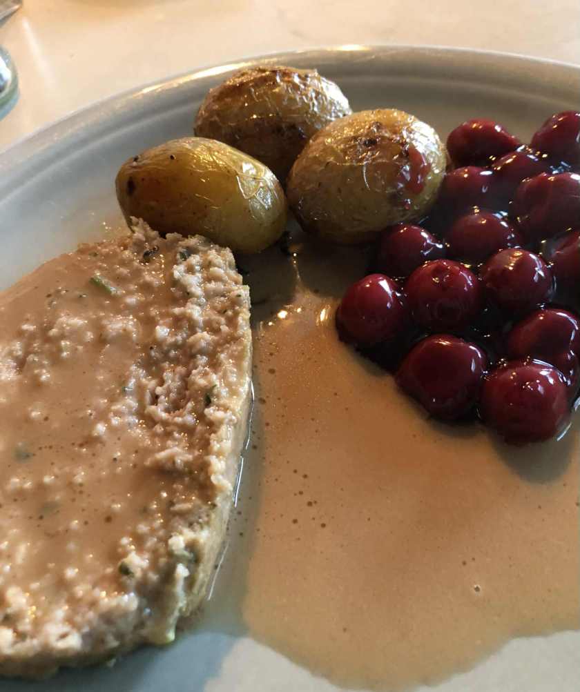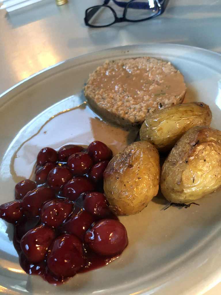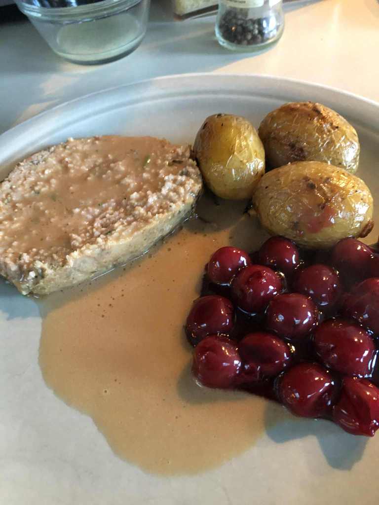 PAIN DE VIANDE, GRENAILLES ROTIES A L’AIL, CERISES DU NORD ET SAUCE AUX CERISES DU NORD