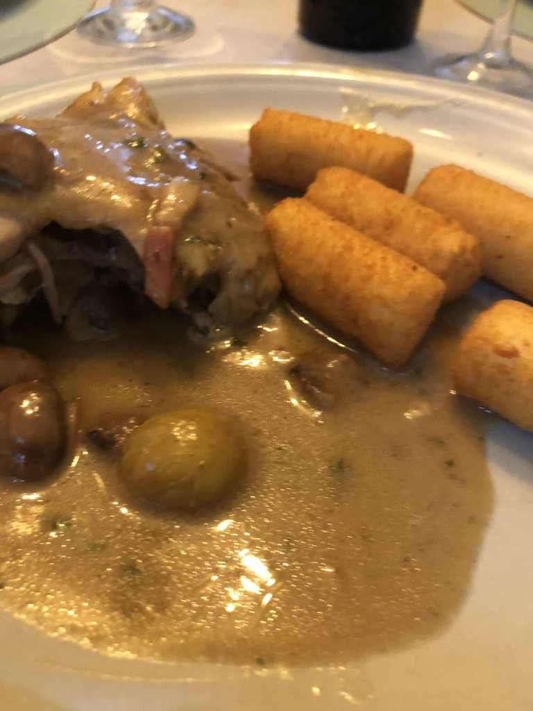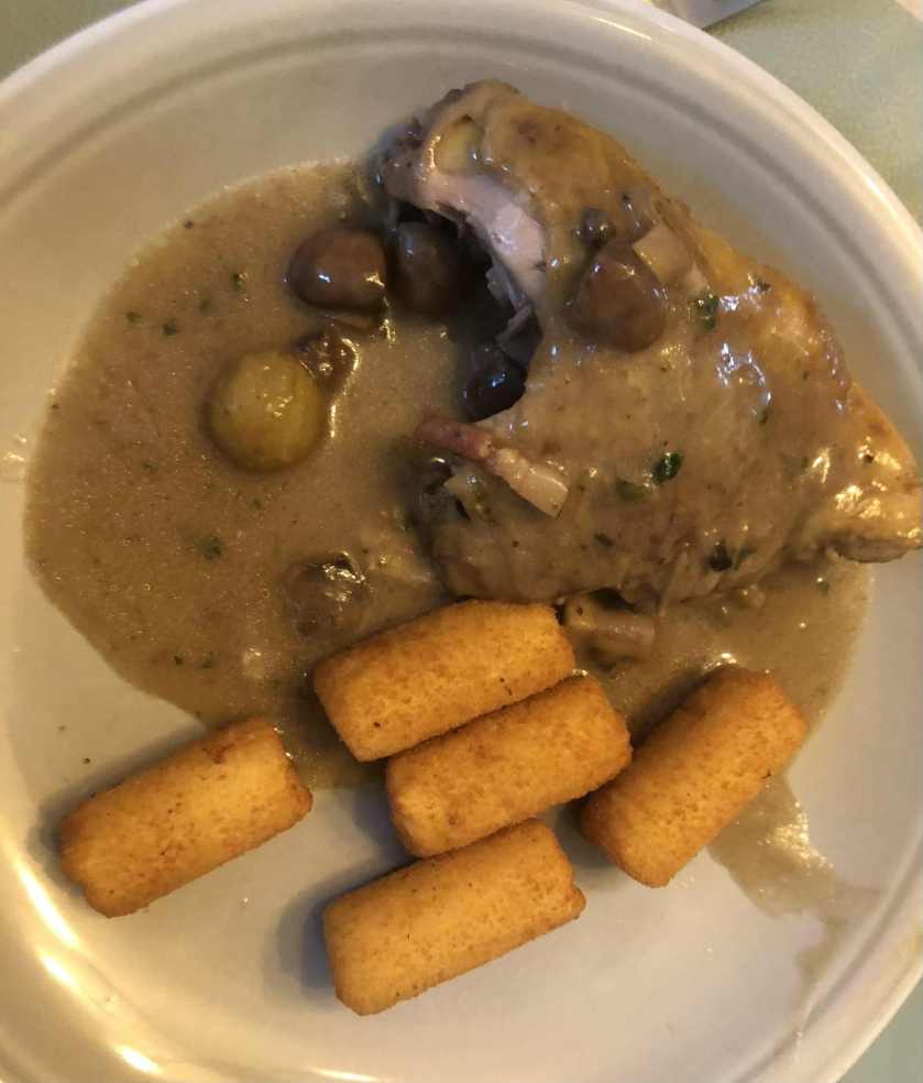 Puis quels éléments dans la sauce : beaucoup d’échalote, des champignons de Paris, des raisins blancs et des châtaignes cuites.