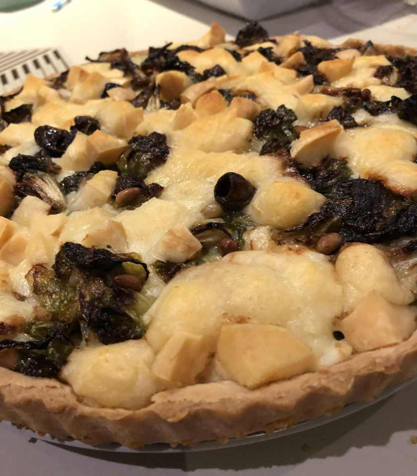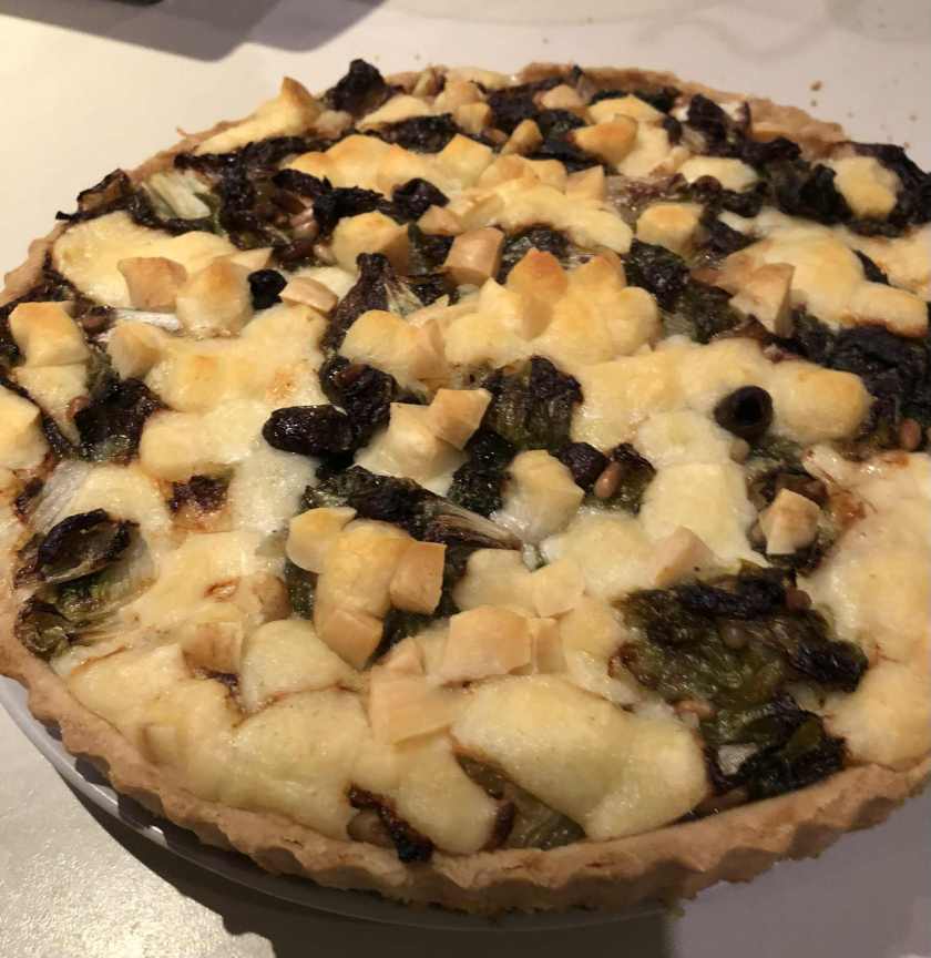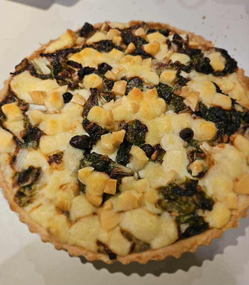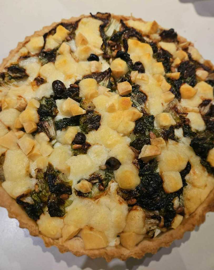 La recette est validée. La garniture et le fond de tarte sont ok. J’ai, par contre, un peu pêché par excès au niveau de la cuisson. J’avais réalisé mon fond de tarte au matin et mis au frigo. Idem pour la garniture et le fromage. En soirée j’ai assemblé, mais quand j’ai mis la tarte au four à 180° C, elle était donc encore assez froide. J’aurais du la monter une petite heure avant de la passer au four, mais nous avions été pris par le temps. Après 30 minutes j’ai vu que le fromage du dessus n’était pas complètement fondu. J’ai donc prolongé de 10 min à 195°C. Après j’ai trouvé la tarte trop peu colorée et j’ai mis 5 min sous grill à 195° C. Je n’aurais pas du car ce fromage, quand il est trop cuit, devient assez caoutchouteux, un peu comme de l’haloumi, et je n’aime pas trop. Donc mettre au four quand tout est tiède et 40 minutes à 180°C et ça devrait être bon.