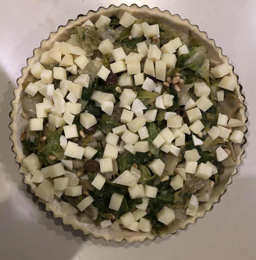 Verser la moitié de la garniture de scarole aux anchois dans le moule. Parsemer la tarte de la moitié de caciocavallo en dés et répéter cette opération une deuxième fois. Poivrer encore un peu.