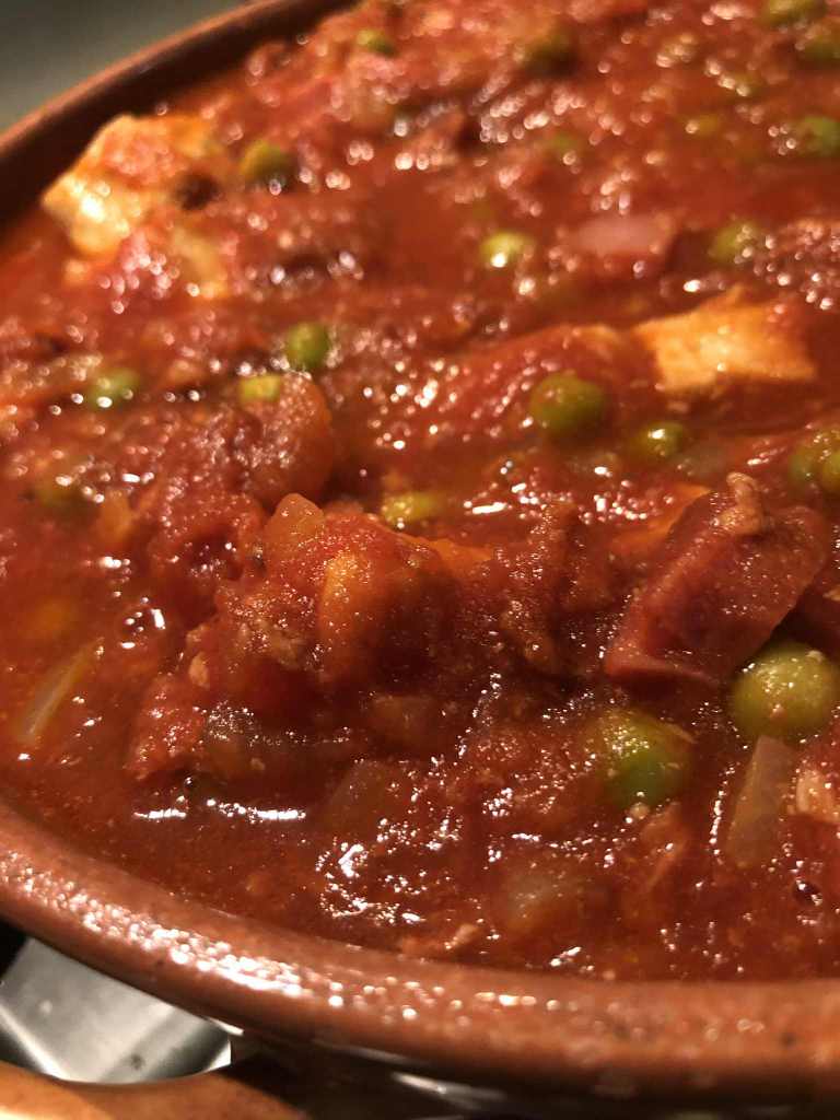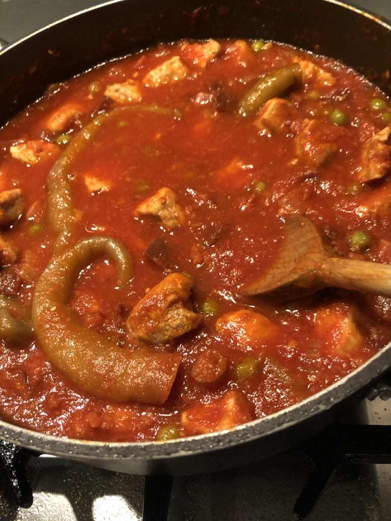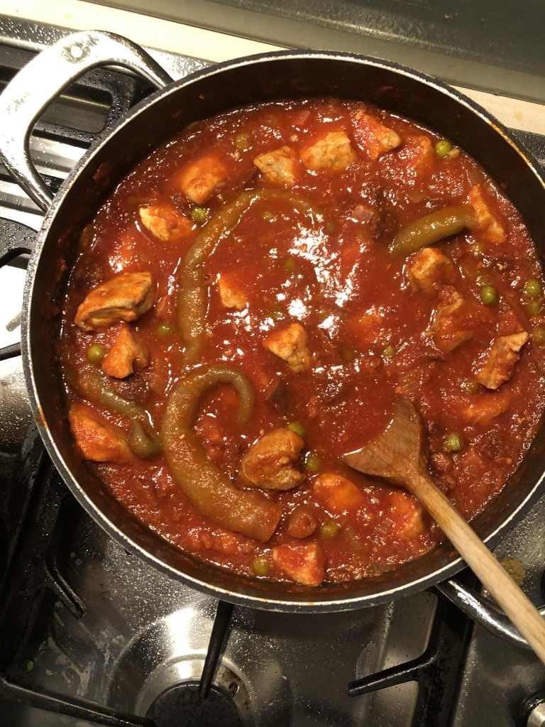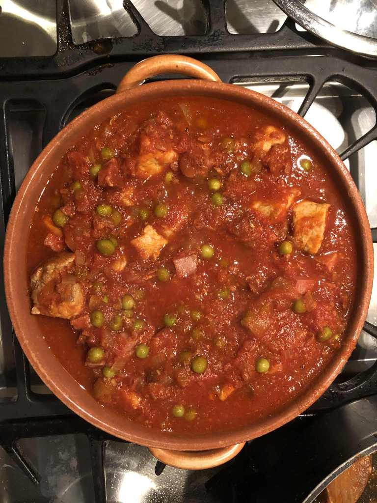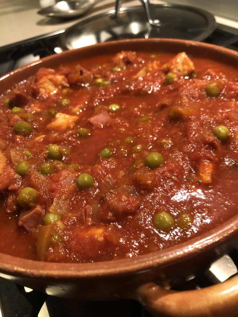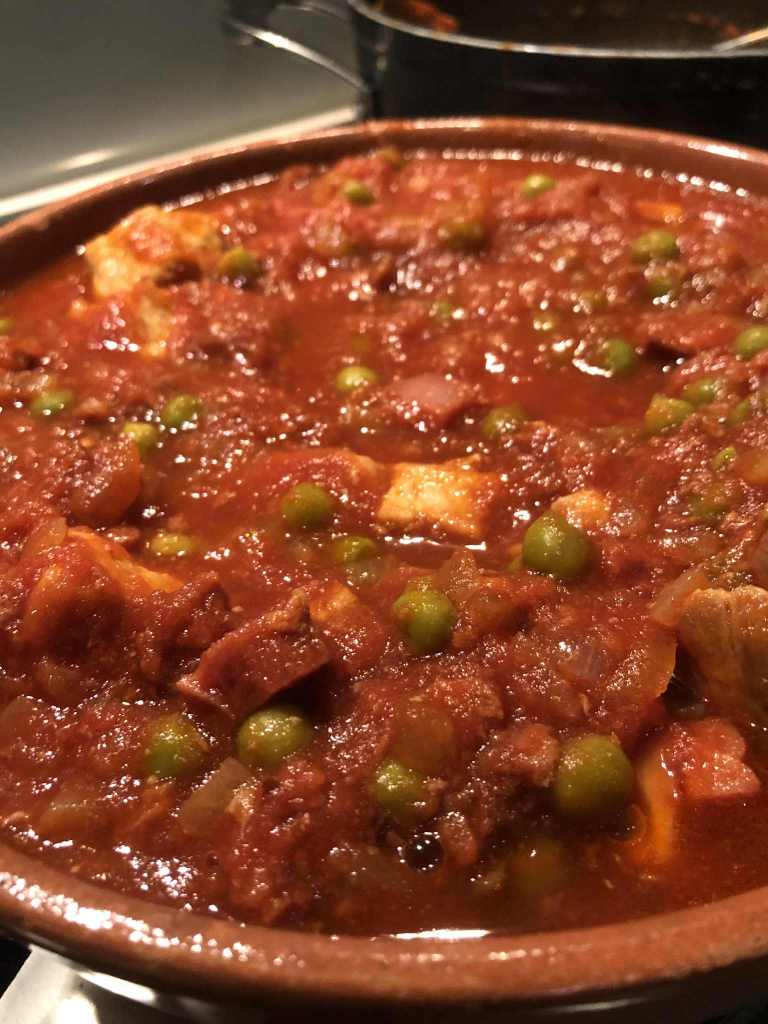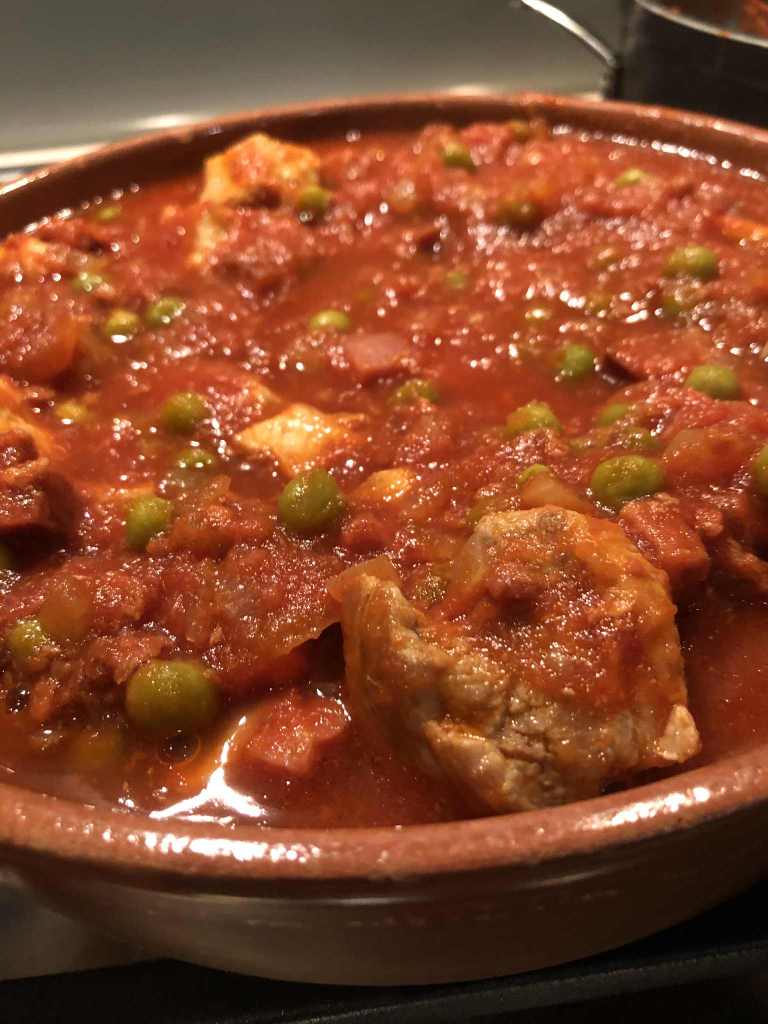 Il s’agit de viande de porc maigre dans une sauce tomate légèrement relevée comportant des petits pois. Quand on sert ce plat à la maison il se présente généralement un plat en argile ou en grès accompagné de pommes de terre et de pain.
