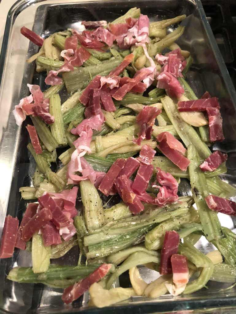 Disposer les cardons bien égouttés dans un plat à gratin beurré. Répartir dessus les allumettes de jambon Ganda.