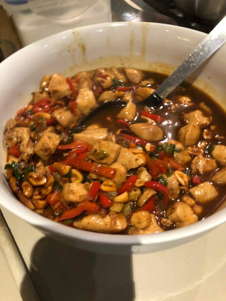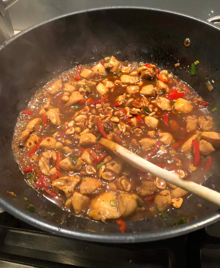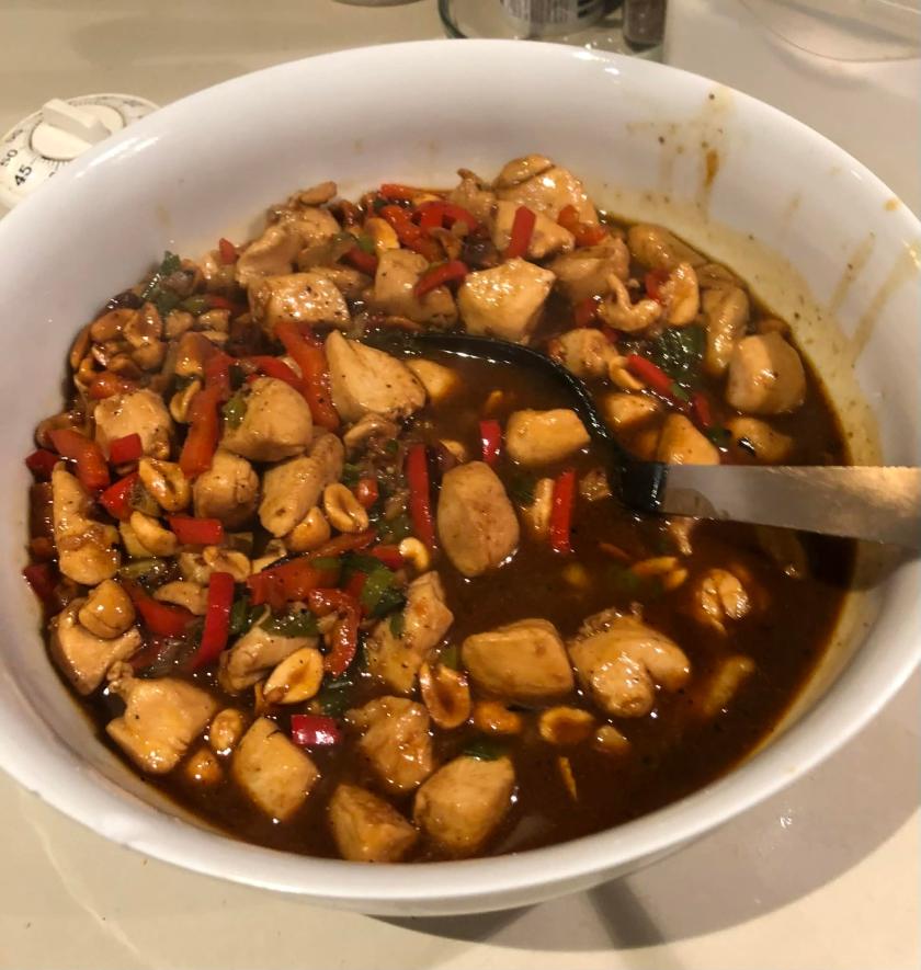C’est un plat sauté épicé à base de poulet mariné, de cacahuètes ou de noix de cajou, de divers légumes, de vin de Shaoxing et de piments. C’est devenu un classique de la cuisine du Sichuan, province du sud-ouest de la Chine. Dans cette région on utilise bien sûr le poivre du Sichuan. On le cuisine plus ou moins épicé selon les régions et selon on le sert à des orientaux ou des occidentaux. Ma version sera donc plutôt douce.