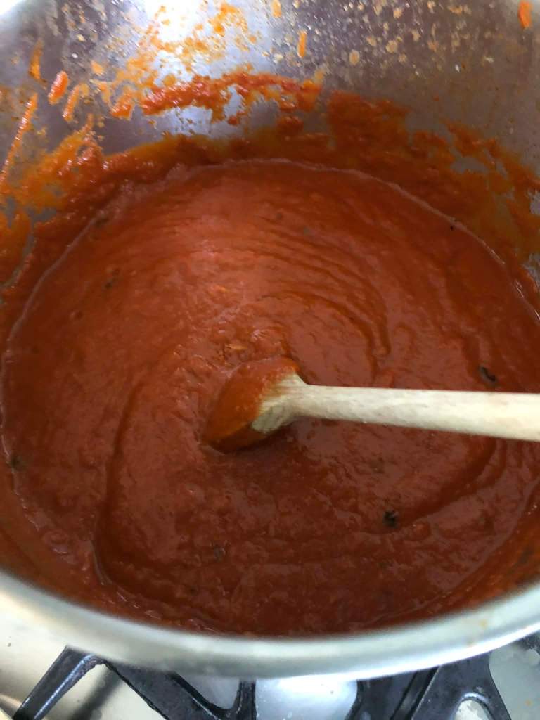 Ajouter l’eau et prolonger la cuisson pendant 20 minutes à feu doux. A ce stade vous allez obtenir une sauce dans laquelle le gras (beurre) se sépare du reste de la sauce.