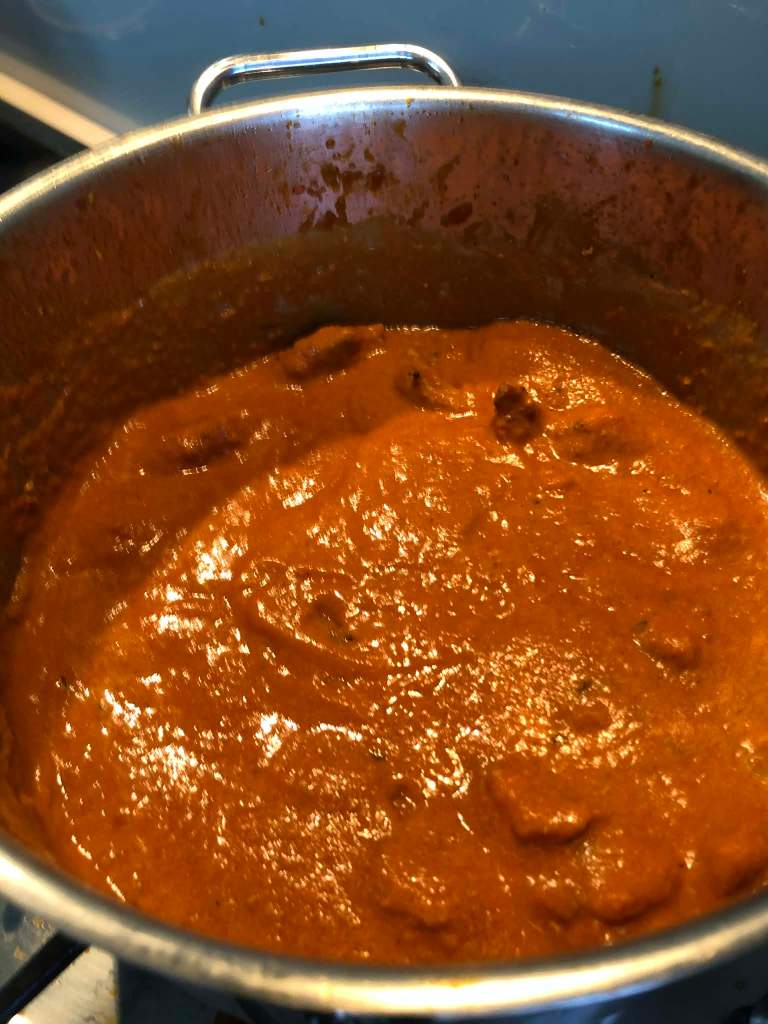 Ensuite ce poulet mariné est cuit dans un four traditionnel tandoor, mais on peut le faire rôtir dans un four. Le poulet est servi dans un curry doux comportant du beurre. La sauce est sur une base de sauce tomate, ail, gingembre bien réduite à consistance onctueuse. Il y a cependant beaucoup de variantes au niveau des épices de la sauce : cardamome, cumin, girofle, cannelle, coriandre, poivre, garam masala, fenugrec. Parfois on utilise aussi une pâte de noix de Cajou pour épaissir la sauce et on termine avec de la coriandre fraîche.
