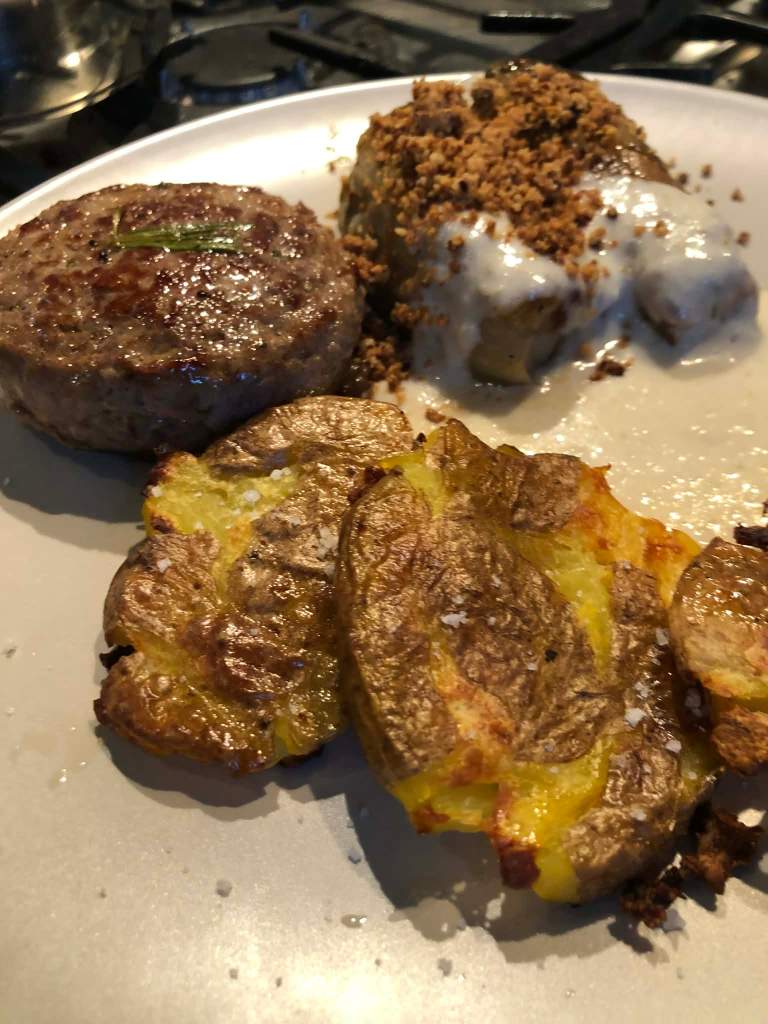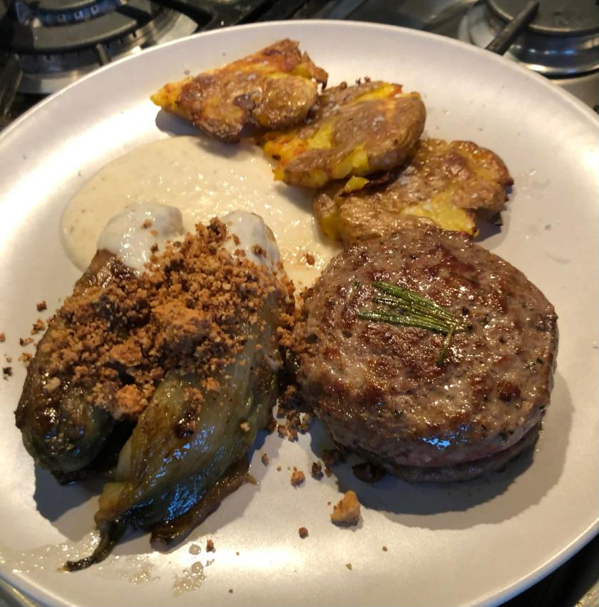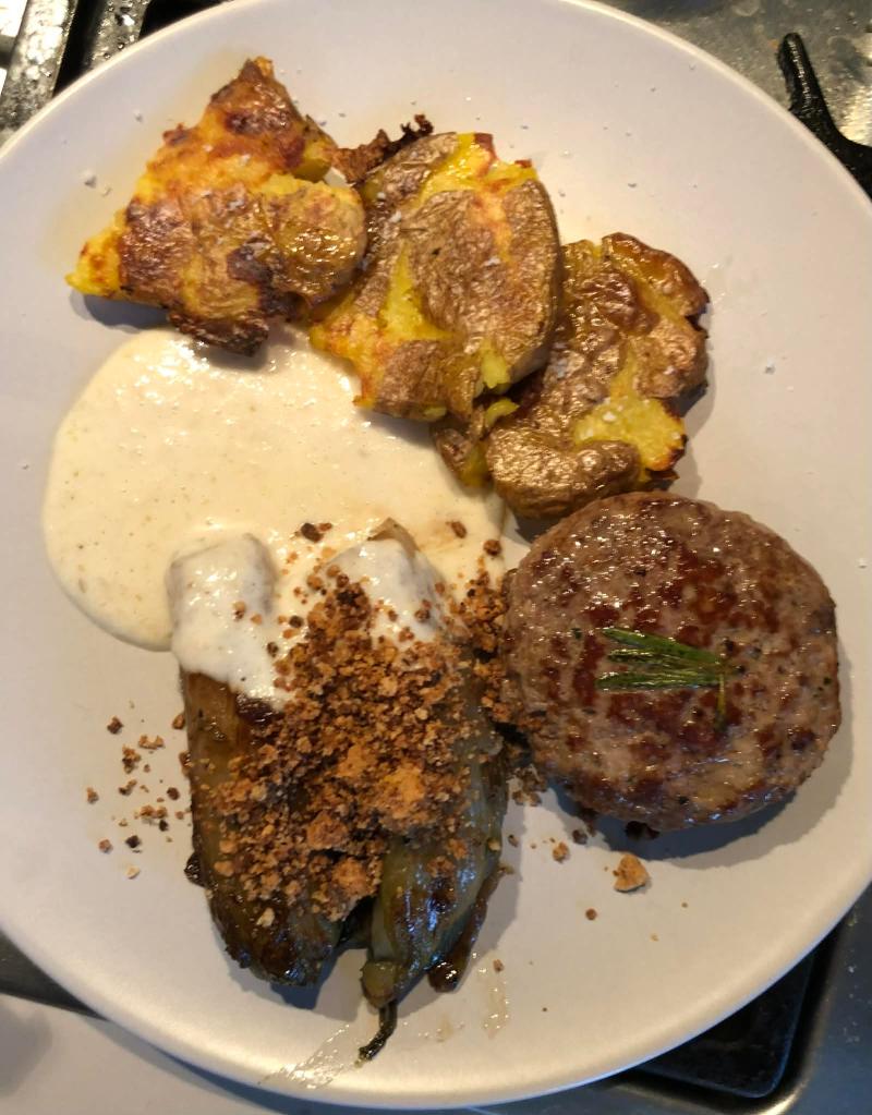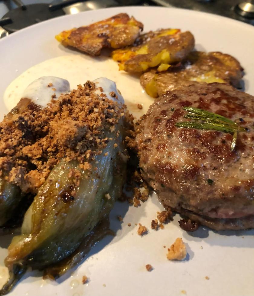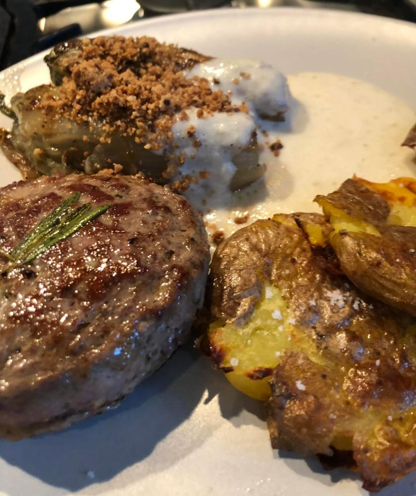 CHICONS BRAISES, CREME D’AMANDES, SMASHED GRENAILLES, CRUMBLE AMANDE-NOISETTE ET BURGERS DE BOEUF