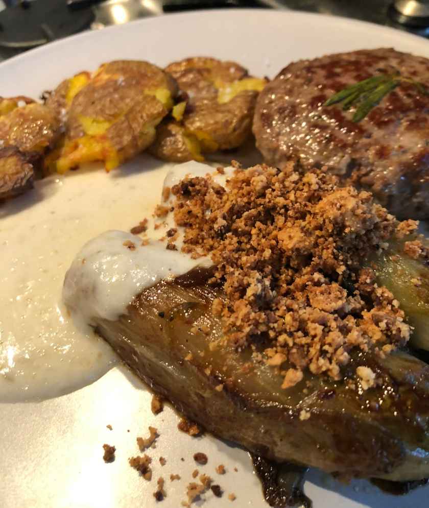 Chicons braisés, crème d’amandes, smashed grenailles, crumble amande-noisette et burgers de boeuf